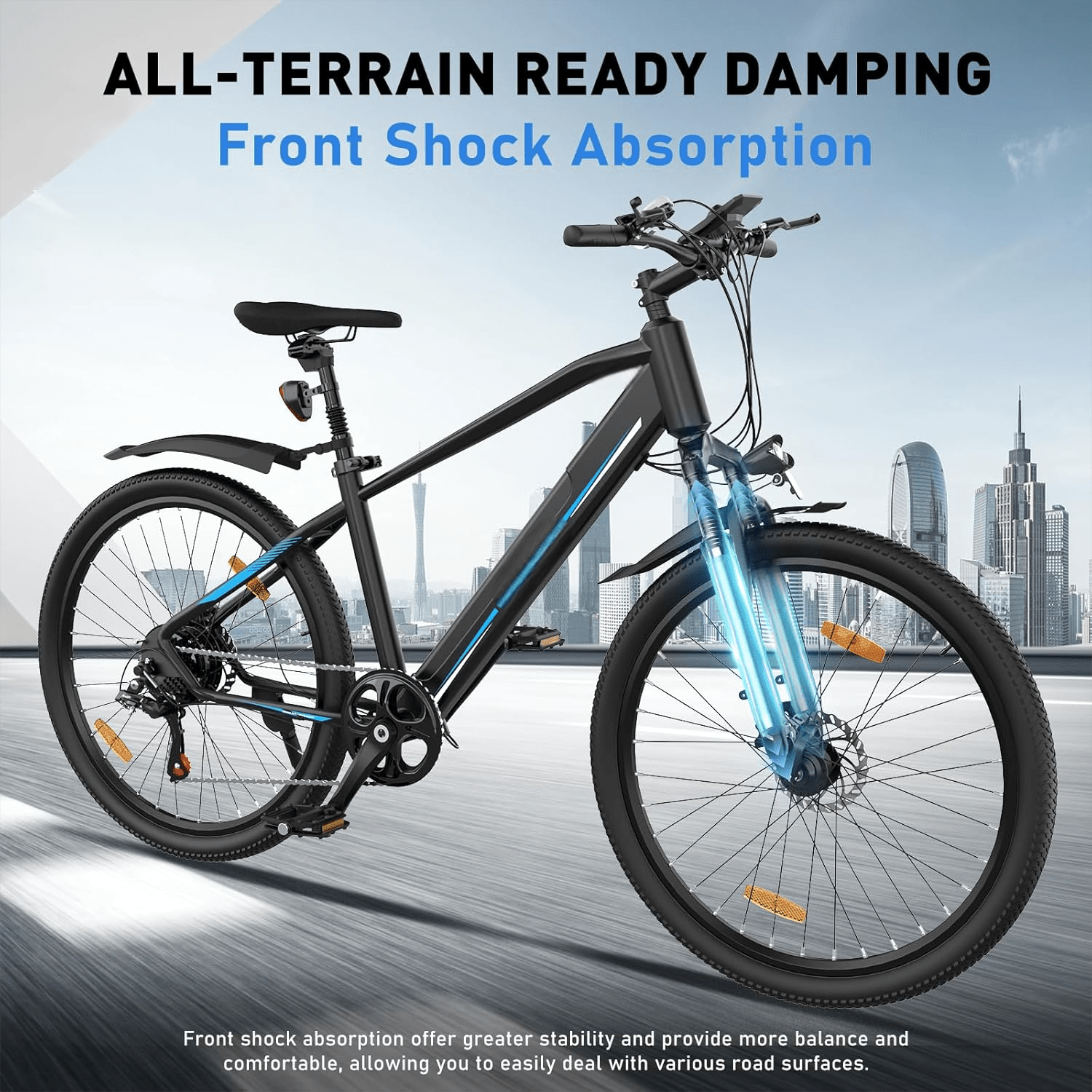26" E-Mountainbike mit 250W Motor, 36V/12Ah Akku, bis 90 km Reichweite, 7-Gang-Schaltung & LCD-Display – ideal für Stadt und Gelände.