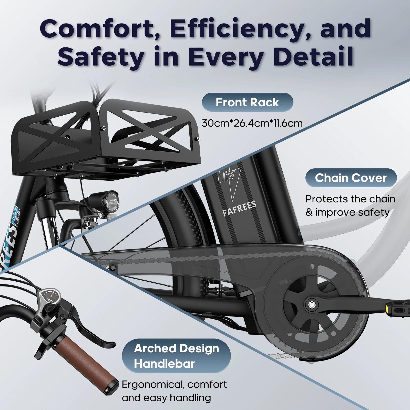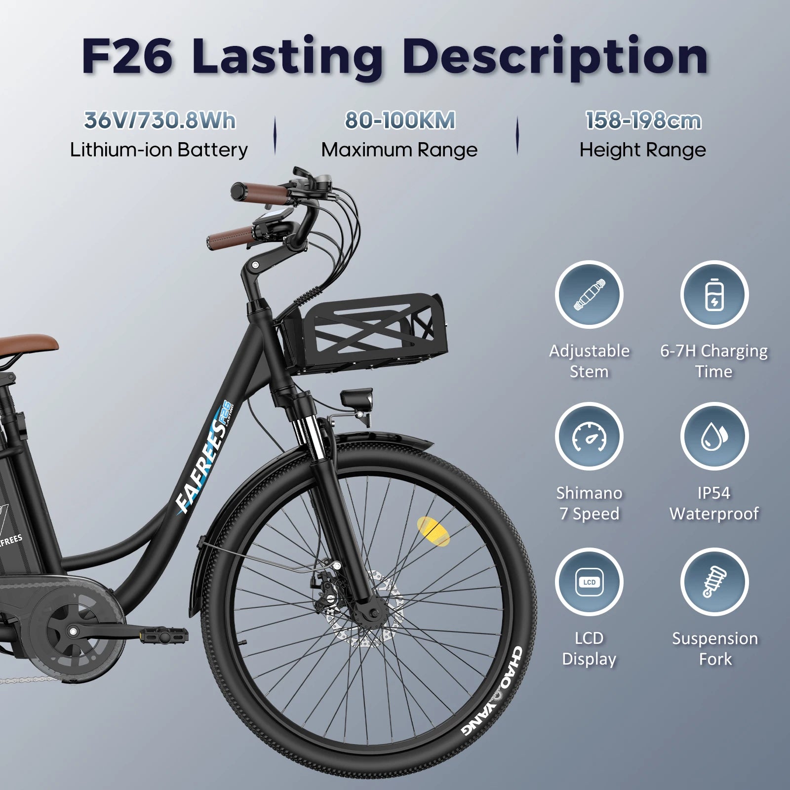 Motor: 250 W Akku: 36 V / 20,3 Ah Lithium Batterie, Reichweite: ca. 40-100 km, Ladezeit: ca. 6–8 Stunden (geschätzt),Max. Geschwindigkeit: 25 km/h, Gewicht: ca. 31 kg, Radgröße: 26 Zoll x1,95 Luftreifen, Passagierkapazität:1Personen, Modell:Fafreesf26lasting, Rahmenmaterial: Aluminium Zertifizierung: CE-zertifiziert gemäß EU-Richtlinien – geprüft auf Sicherheit und Qualität