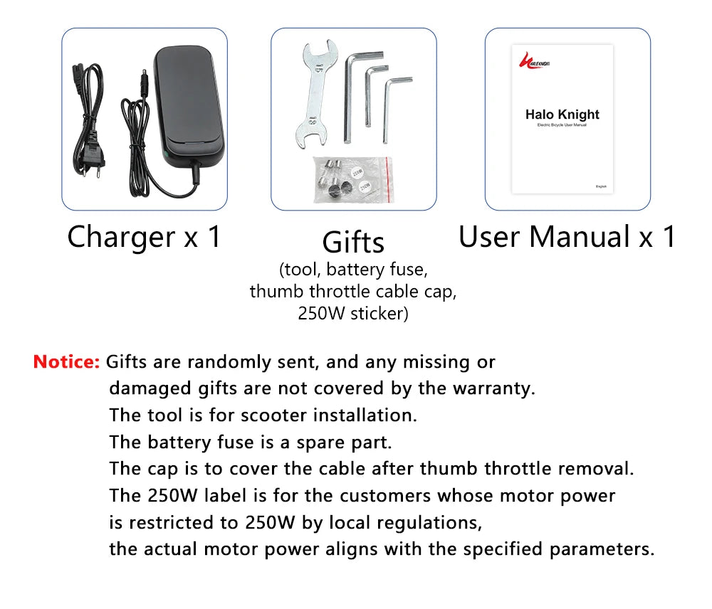 Motor: 1000W Akku: 48 V / 19,2Ah Lithium Batterie, Reichweite: ca.50-100 km, Ladezeit: ca. 4–8 Stunden (geschätzt),Max. Gelände-Nutzung / Privatgelände (nicht für Straßenverkehr zugelassen), Geschwindigkeit:50km/h, Gewicht: ca. 30 kg, Radgröße: 27,5 Zoll x3.0 Luftreifen, Passagierkapazität:1Personen, Modell:HaloKnightH03, Rahmenmaterial: Aluminium Zertifizierung: CE