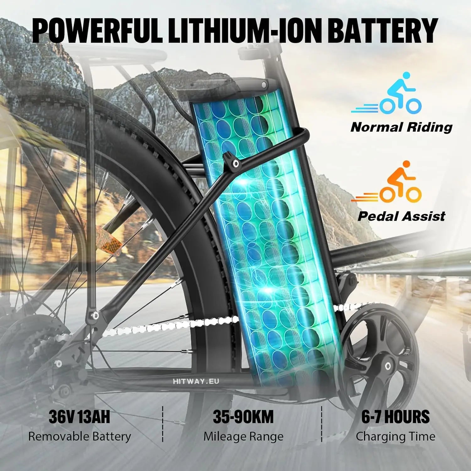 🔋 36V 13Ah Lithium-Akku (austauschbar) – Reichweite bis zu 90 km, volle Ladung in 6–8 Stunden