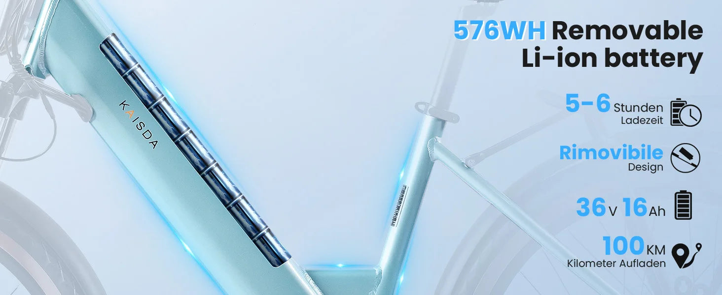🔋 36 V 16 Ah Lithium-Akku – Hohe Kapazität für eine Reichweite von ca. 50–80 km pro Ladung