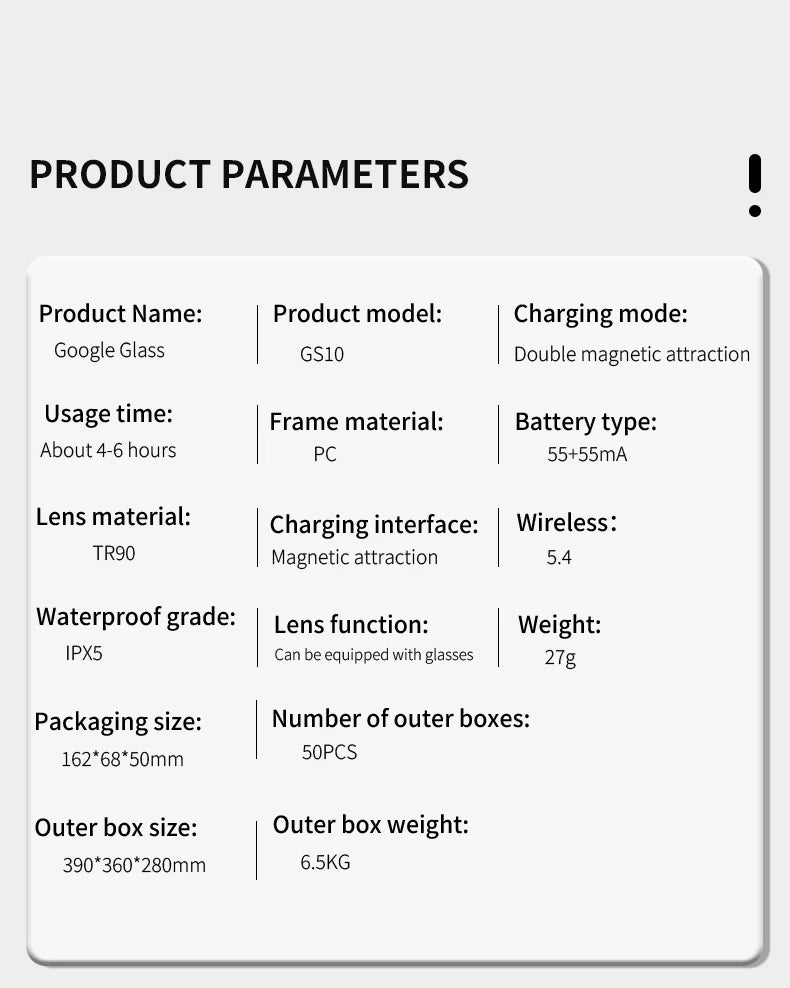 1× Smart-Brille, 1× USB-Ladekabel, 1× Reinigungstuch für die Gläser, 1× Benutzerhandbuch, 1× Aufbewahrungsbox