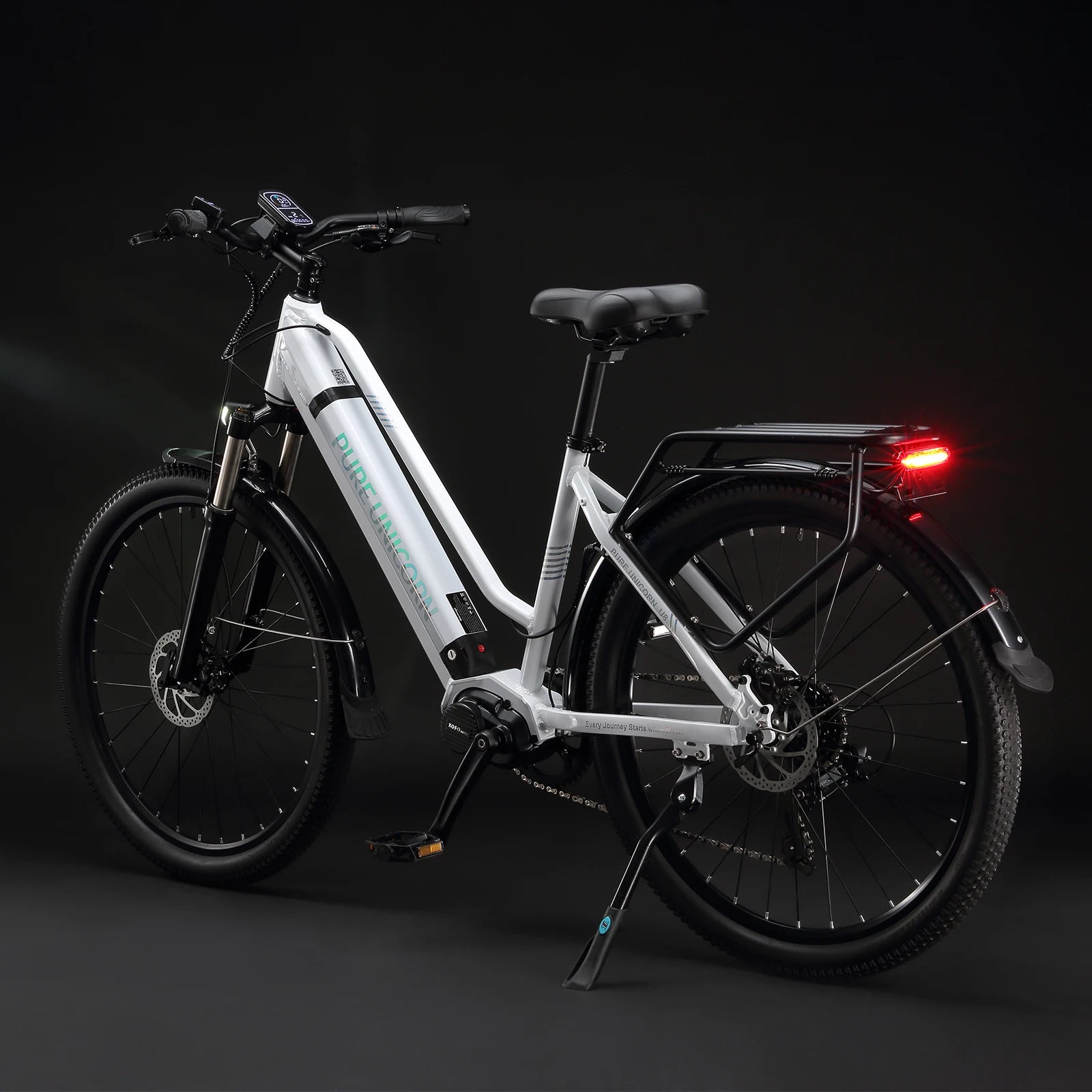 Das leichte Aluminium-Rahmen-Design (29 Zoll), kombiniert mit Luftfederung vorne und hydraulischen Scheibenbremsen, garantiert ein geschmeidiges und sicheres Fahrerlebnis – ob im Alltag oder auf langen Touren. Dank der 9-Gang-Schaltung, des modernen LCD-Farbdisplays und der kompletten Ausstattung mit Lichtsystem, Kotflügeln und IP54-Wasserschutz ist das PURE UNICORN U6 bestens für jede Situation gerüstet.“
