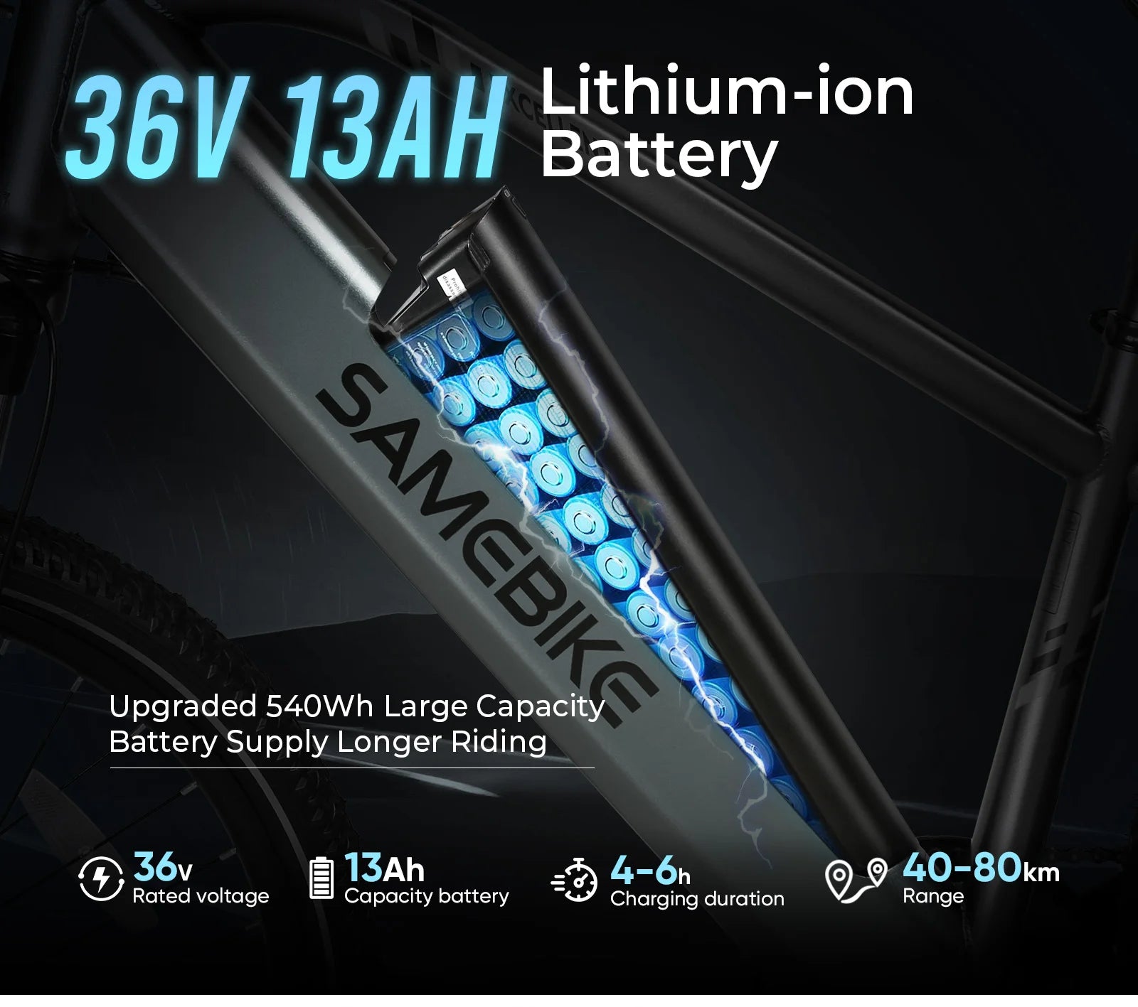 Motor: 250 W Akku (Peak 500 W): 36 V / 13 Ah Lithium Batterie, Reichweite: ca.40-90 km, Ladezeit: ca. 6–8 Stunden (geschätzt),Max. Geschwindigkeit: 25 km/h, Gewicht: ca. 29 kg, Radgröße: 26 Zoll x2,12 Luftreifen, Passagierkapazität:1Personen, Modell:SamebikeRSA01, Rahmenmaterial: Aluminium Zertifizierung: CE,Stil: Luxus E- City & Mountainbike Typ